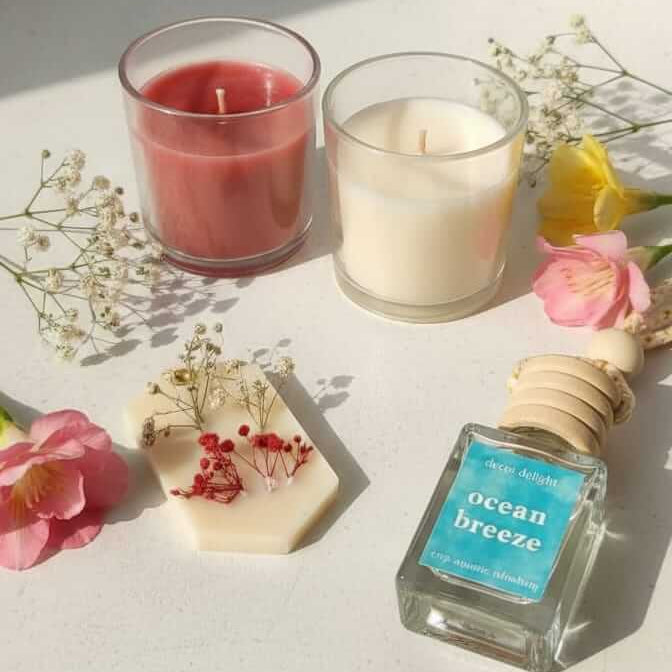 Immerse your senses in pure luxury — featuring the rich Ocean Breeze car freshener, calming 2 Sented candle, and soothing Pachouli fragrance wax tablet.